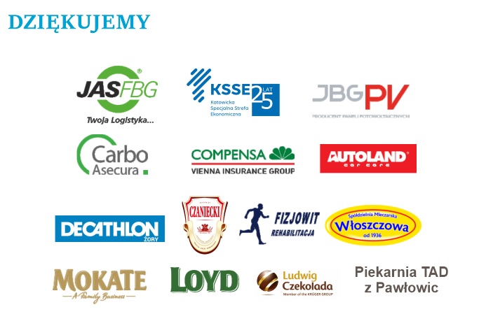 Bieg Pawłowicki ma już siedmioletnią historię. Od samego początku są z nami firmy, które wspierają nasze wydarzenie. Nie inaczej jest w roku 2021. Wspierają nas Centrum logistyczne JAS-FBG S.A., Katowicka Specjalna Strefa Ekonomiczna, Firma JBG -2 producent paneli fotowoltaicznych marki JBG-PV, Firma Broker Carbo Asecura S.A., Compensa Towarzystwo Ubezpieczeń S.A., Pawłowicki Oddział Okręgowej Spółdzielni Mleczarskiej „Włoszczowa”, Firma Autoland z Pawłowic, Gabinet Rehabilitacji Fizjowit z Pawłowic, Piekarnia TAD Tadeusza Pisarka z Pawłowic, Czanieckie Makarony Sp. z o.o. z Czańca, firma Ludwig Czekolada ze Skoczowa, sklep Decathlon z Żor. W tym roku do grona sponsorów dołączyła również firma Mokate, która w niedzielę będzie częstowała uczestników i gości biegu swoimi produktami.