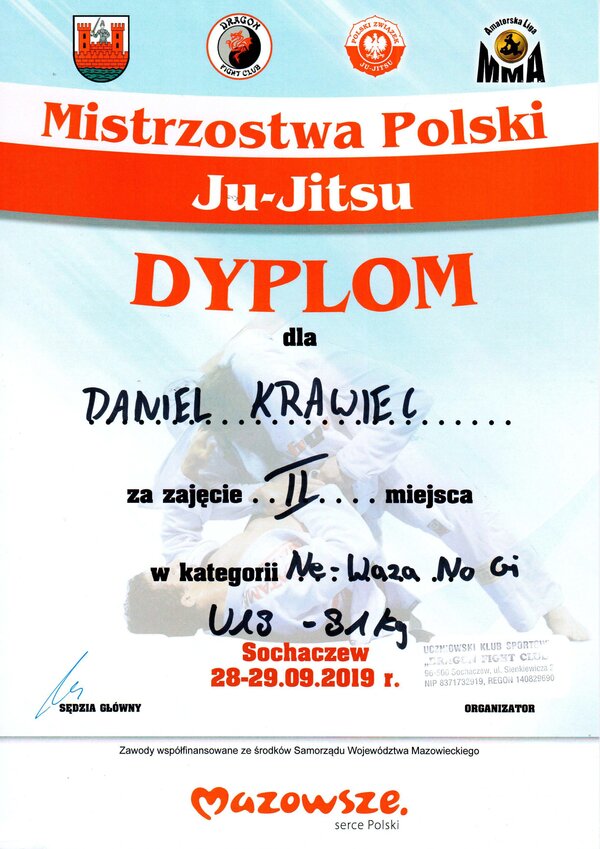 W zawodach wzięło udział 850 zawodników z kilkudziesięciu klubów z całej Polski. Dwa dni ostrych zmagań, wysoki poziom zawodników zaowocowały dla klubu zdobyciem przez jednego z zawodników miejscem na podium.UKS Budo Pawłowice reprezentowali zawodnicy: Daniel Krawiec, Marcel Żmija, Milosz Janecki. W konkurencji walk ju-jitsu Ne waza U18 Daniel Kawiec zdobył II miejsce i tytuł Wicemistrza Polski w kat. -81 kg. Zawody odbyły się pod patronatem Polskiego Związku Ju-Jitsu organizatorem był Dragon Fight Club z Sochaczewa. Kierownikiem drużyny był trener ju-jitsu Leszek Kremiec a asystentem Instruktor Dawid Głowala.Zajęcia ju-jitsu odbywają się w Zespole Szkolno Przedszkolnym w Pawłowicach ul. Pukowca 4 w każdą środę i piątek od 18.45 do 20.45. Zapraszamy!