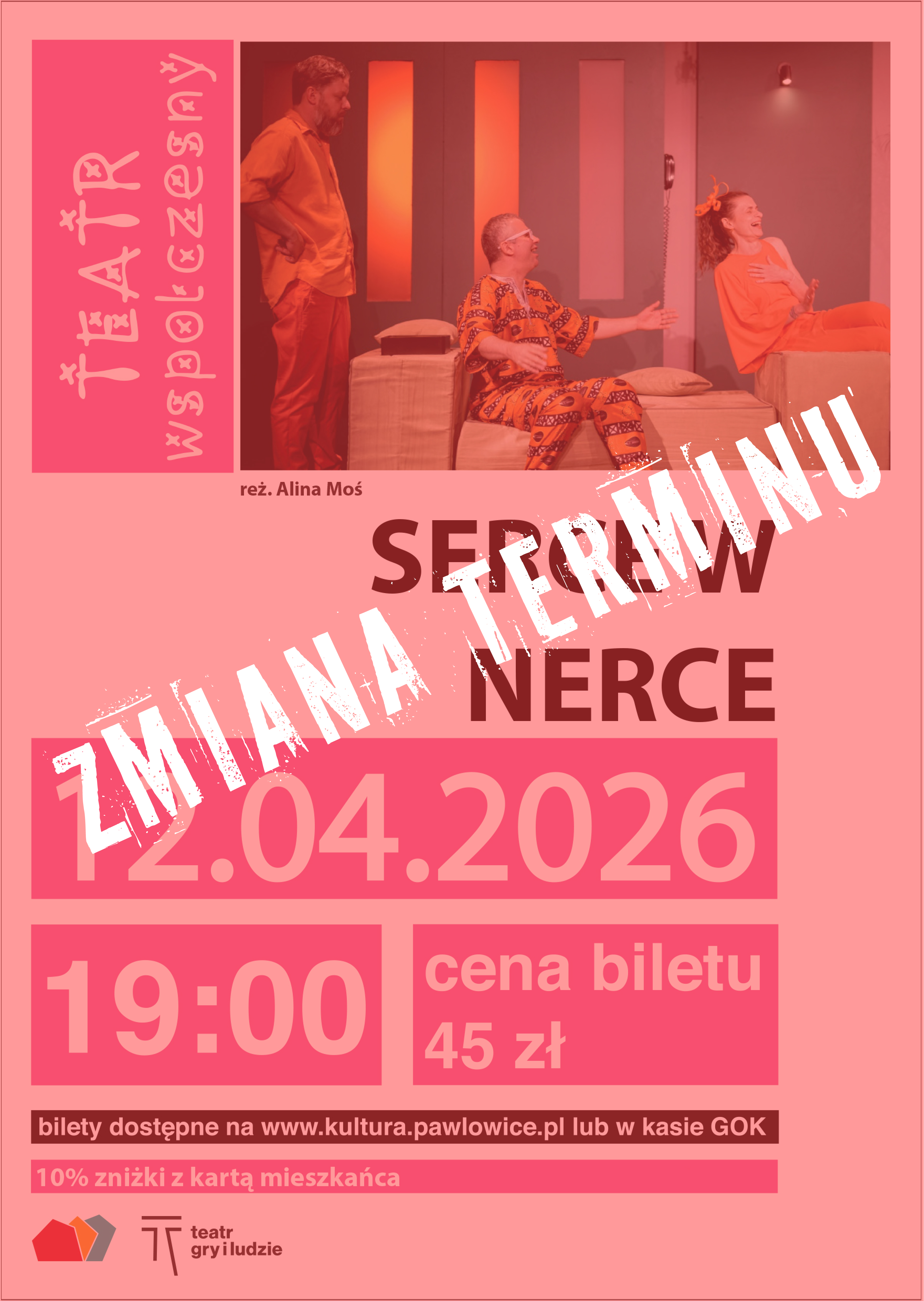 Z powodu choroby aktorów termin spektaklu „Serce w nerce” został zmieniony z 12.04.2026 na 10.05.2026.