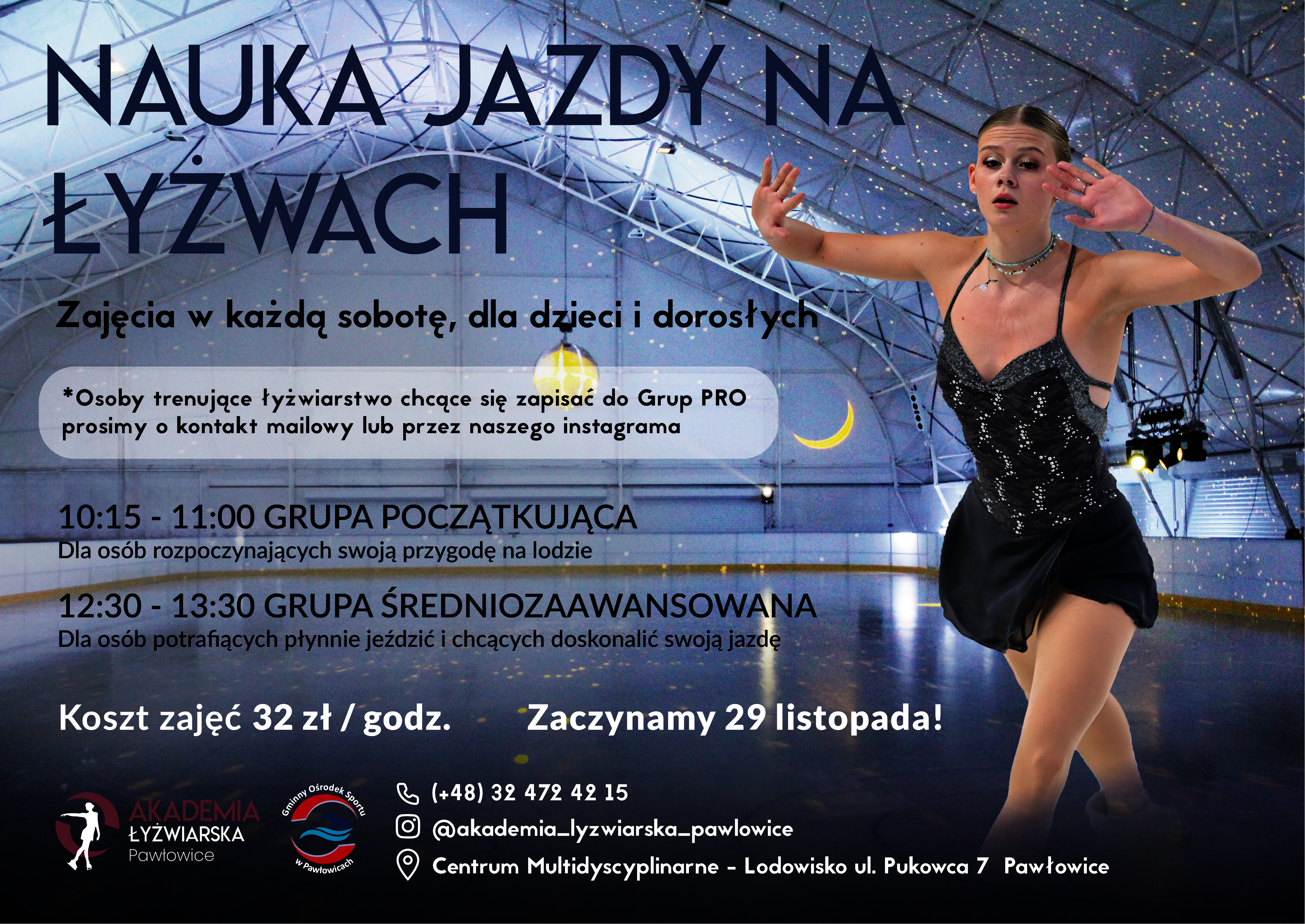 Zapisy: Pierwsze zajęcia (29 listopada) telefonicznie w kasie GOS 32 4724 215 płatność w kasie lodowiska w dniu zajęć.