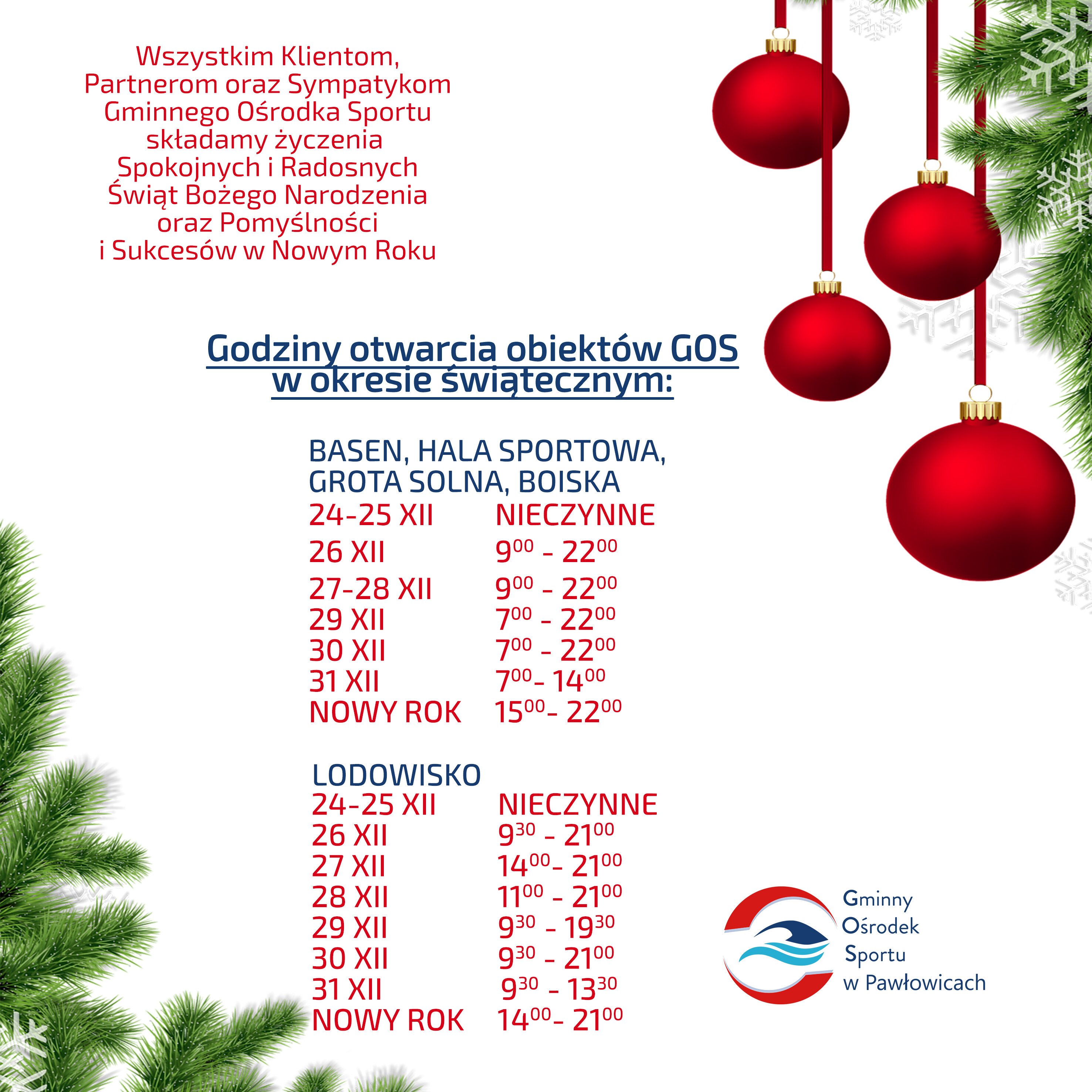 Godziny otwarcia obiektów Gminnego Ośrodka Sportu w Pawłowicach.