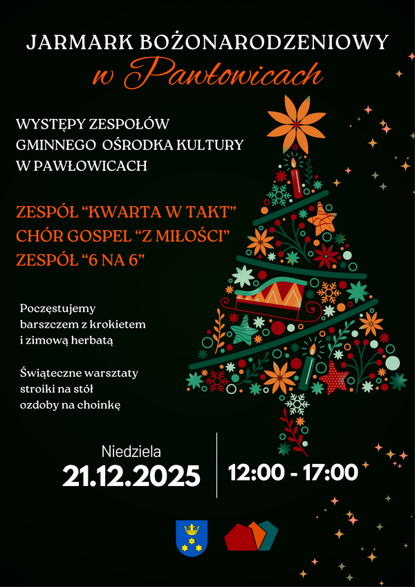 Zapraszamy na Jarmark Bożonarodzeniowy, który odbędzie się 21 grudnia 2025 roku na rynku w Pawłowicach. W tym roku nasze wydarzenie będzie miało koncertowy charakter!
