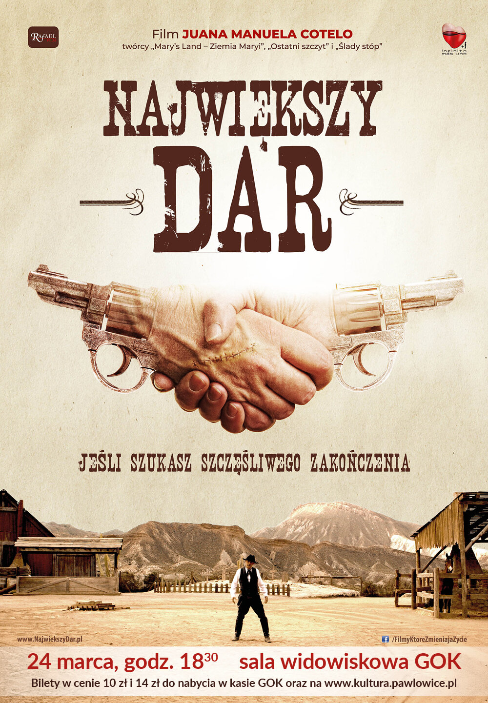 „Największy dar” to fabularyzowany dokument w konwencji westernowej komedii i kina faktu. W scenerii miasteczka rodem z Dzikiego Zachodu reżyser stawia pytanie „czy w takiej historii ludzie muszą się na końcu pozabijać? Czy jest możliwe przebaczenie?” Okazuje się, że prawdziwe historie kończą się czasem inaczej niż w westernie.24 marca, godz. 18:30, sala widowiskowaBilety w cenie 10 zł i 14 zł do kupienia w kasie GOK oraz online.