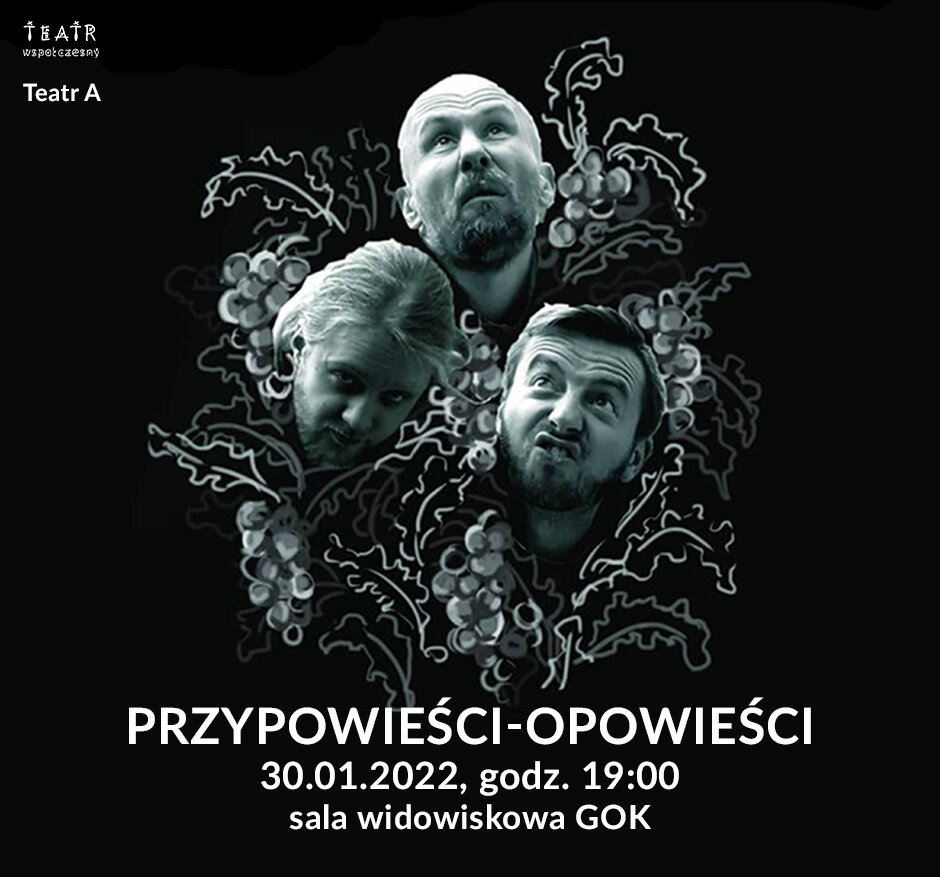 PRZYPOWIEŚCI-OPOWIEŚCIPodczas spektaklu przyjrzymy się pastuszkom pod Betlejem, uratujemy od konsumpcji baranka wielkanocnego, poszukamy wspólnie zagubionej owieczki, odwołamy się do psalmu o Dobrym Pasterzu a przy okazji zastanowimy, czy nasza religijność musi być smutna? Aby mieć do siebie zdrowy dystans, warto pamiętać, że czasem sami jesteśmy mali i zabawni.UWAGA! Spektakl nie jest adresowany do tych, którym Pan Bóg niechcący nadepnął na poczucie humoru. Wszyscy pozostali mile widziani.NOWY TERMIN!Z powodu przerwy w dostawie prądu przenieśliśmy spektakl na 6 lutego, godz. 19:00. Bilety zachowują ważność. Jeśli komuś termin nie odpowiada, zapraszamy do kasy po zwrot należności - prosimy o wcześniejszy kontakt z biurem GOK.6 lutego, godz. 19:00, sala widowiskowa GOKBilety w cenie 25 zł do kupienia w biurze GOK oraz online.Prosimy o zapoznanie się z zasadami bezpieczeństwa dla uczestników wydarzeń kulturalnych.