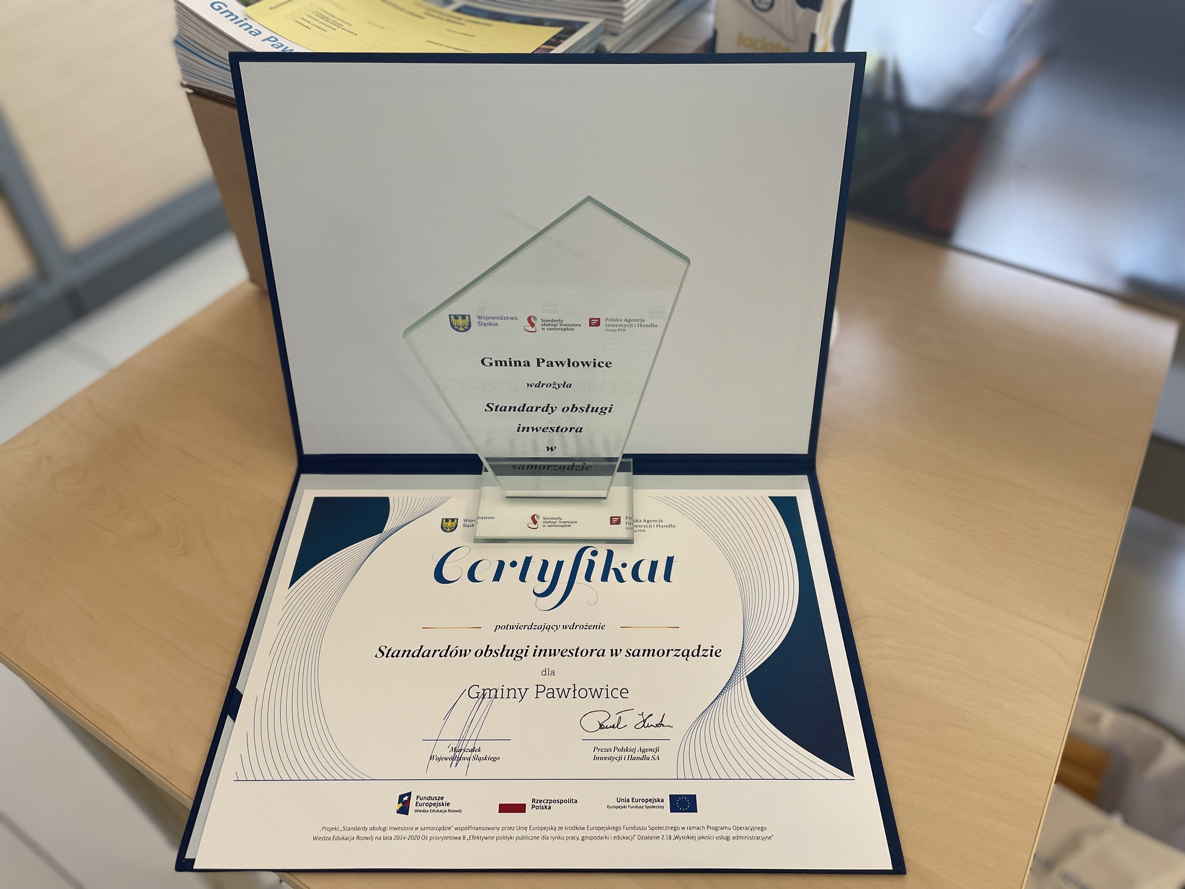 To efekt udziału w projekcie „Standardy obsługi inwestora w samorządzie” przeznaczonego dla jednostek samorządu terytorialnego województwa śląskiego. Jego celem było podniesienie jakości obsługi inwestorów w samorządach. Projekt był współfinansowany ze środków Unii Europejskiej w ramach Europejskiego Funduszu Społecznego – Program Operacyjny Wiedza Edukacja Rozwój na lata 2014 – 2020.