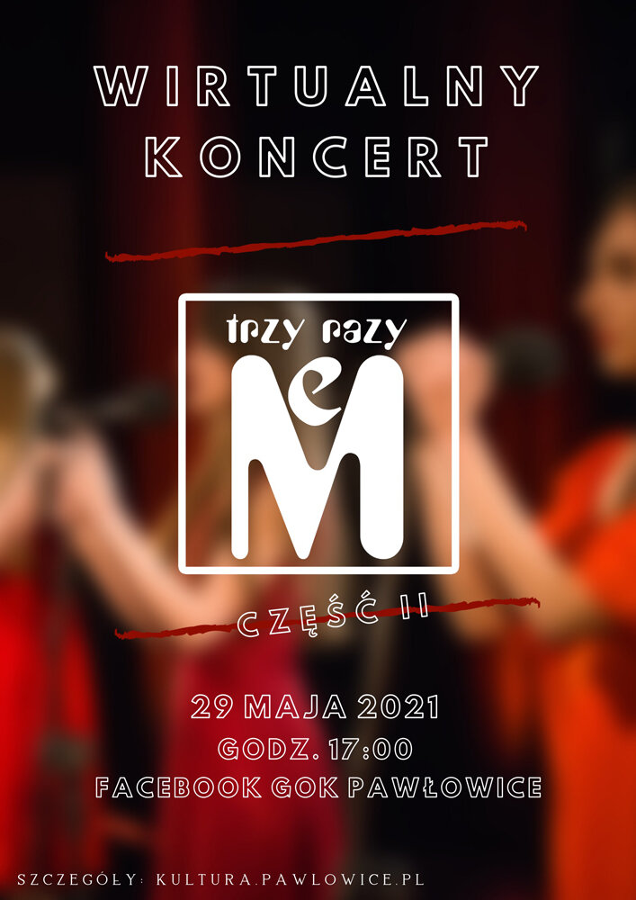 Wspominamy wszystkie spektakle przygotowane przez grupę musicalową „eM” w Gminnym Ośrodku Kultury w Pawłowicach od początków jej istnienia. To już 12 lat, odkąd młodzi ludzie stanęli na pawłowickiej scenie, by przygotować spektakl muzyczny. Zaczęło się od „Ada to nie wypada” z muzyką z polskich filmów przedwojennych, później zmiana nastroju i powstał „Green Light” z piosenkami z musicalu „Grease”. Kolejnym spektaklem była „Alicja po tamtej stronie” w zestawieniu mocnego, rockowego brzmienia z lirycznymi balladami, a zaraz po niej powstało „R&J” w klimatach rock&disco lat 80. Chwila oddechu i narodził się kolejny musical z utworami z Kabaretu Starszych Panów – „Upiorny Teatr”. Chyba nie było aż tak upiornie, bo młodzież została i stworzyła „Green Light 2”, inny skład, inna fabuła, lecz te same utwory z „Grease”. Po tym spektaklu grupa musicalowa dotknęła poważniejszych tematów, związanych z trudami i problemami młodzieży, a całość dopełniły utwory ze znanego wszystkim musicalu „Metro”. I tak właśnie powstała „Karuzela Zderzeń”.Wszystkie te spektakle wyreżyserowała niezastąpiona Ewa Sikora, której pomysły nigdy się nie kończą. Ewa nie tylko pisze scenariusze, ale także pracuje z aktorami nad ich dykcją, interpretacją i warsztatem aktorskim, tworzy scenografię i projektuje kostiumy. Bez wahania można ją nazwać matką naszego pawłowickiego teatru.„Trzy razy eM”, czyli MIŁOŚĆ, MUZYKA, MONIKA.Żaden spektakl nie powstałby, gdyby nie nasza instruktorka muzyczna Monika Kurowska, która w tym roku obchodzi jubileusz 15-lecia swojej pracy w Gminnym Ośrodku Kultury. Od początku przygotowywała spektakle od strony muzycznej, opracowywała utwory i pracowała z młodymi artystami nad ich warsztatem wokalnym. To właśnie jubileusz Moniki stał się iskrą zapalną do powstania koncertu „Trzy razy eM”, bo przecież miłość i muzyka to właśnie Monika.Nasz koncert składa się z dwóch części.Pierwsza część swoją premierę będzie miała 1 maja 2021 r. o godz. 17:00, a w jej skład wchodzą utwory z pierwszych trzech spektakli: „Ada to nie wypada”, „Alicja po tamtej stronie”, „R&J”. Natomiast w drugiej części koncertu, 29 maja 2021 o godz. 17:00, usłyszycie i zobaczycie wykonania piosenek ze spektakli „Upiorny Teatr”, „Green Light” i „Green Light 2” oraz „Karuzela Zderzeń”.Organizatorką i reżyserem całego koncertu jest Klaudia Macharzyńska - instruktorka GOK i wieloletnia uczestniczka naszych zajęć.