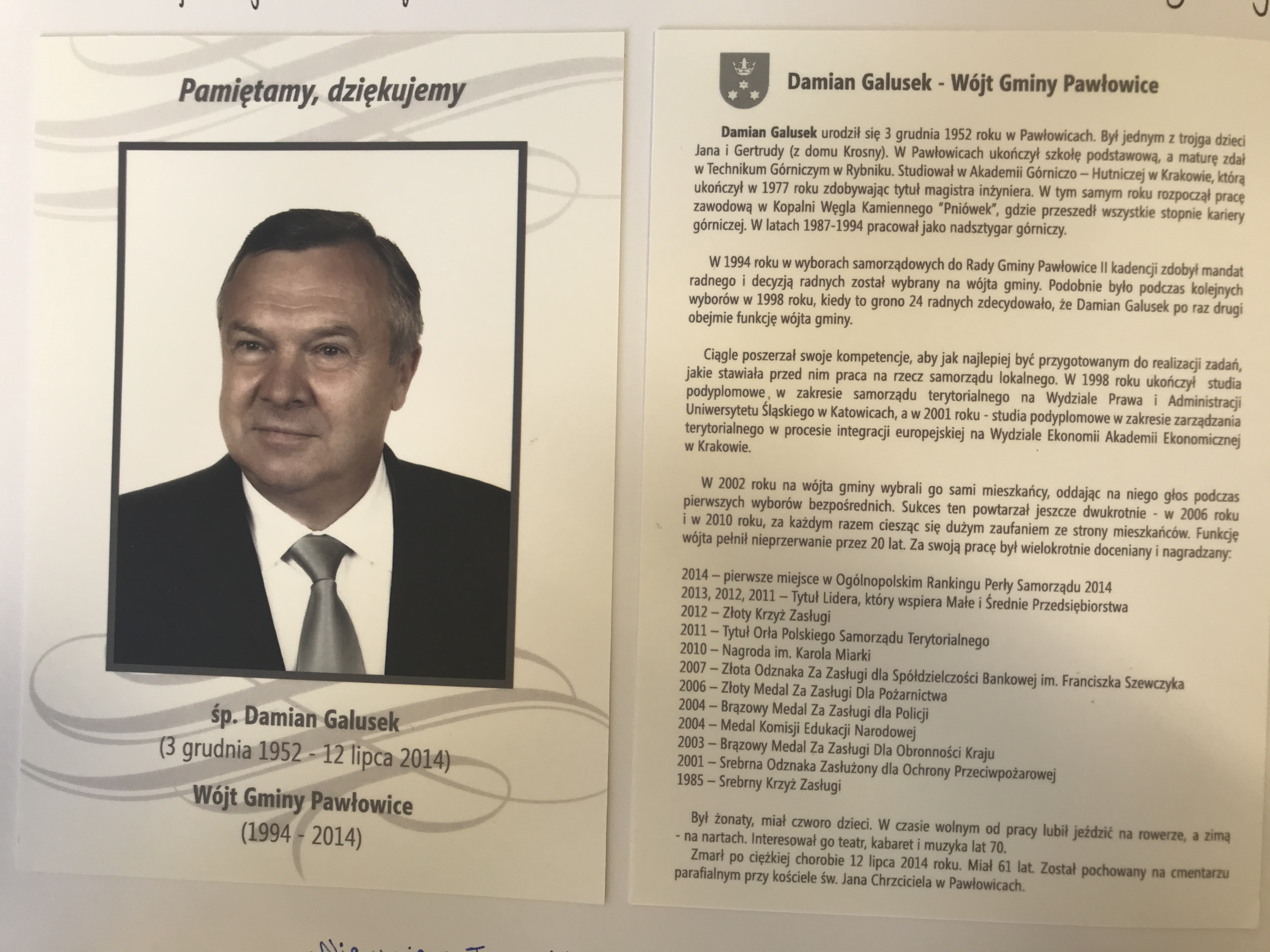 W księdze kondolencyjnej i za pośrednictwem strony internetowej dokonano kilkadziesiąt wpisów z wyrazami współczucia. ***Uchwała o wygaśnięciu mandatu wójta - 24 lipca 2014W związku ze śmiercią wójta gminy Damiana Galuska, radni podczas sesji 24 lipca podjęli uchwałę o wygaśnięciu mandatu wójta. To była wyjątkowa uchwała i wyjątkowa sesja. Przed głosowaniem radni uczcili minutą ciszy pamięć zmarłego. Na miejscu, które zwykle zajmował śp. Damian Galusek leżała księga z kondolencjami i czerwoną różą.