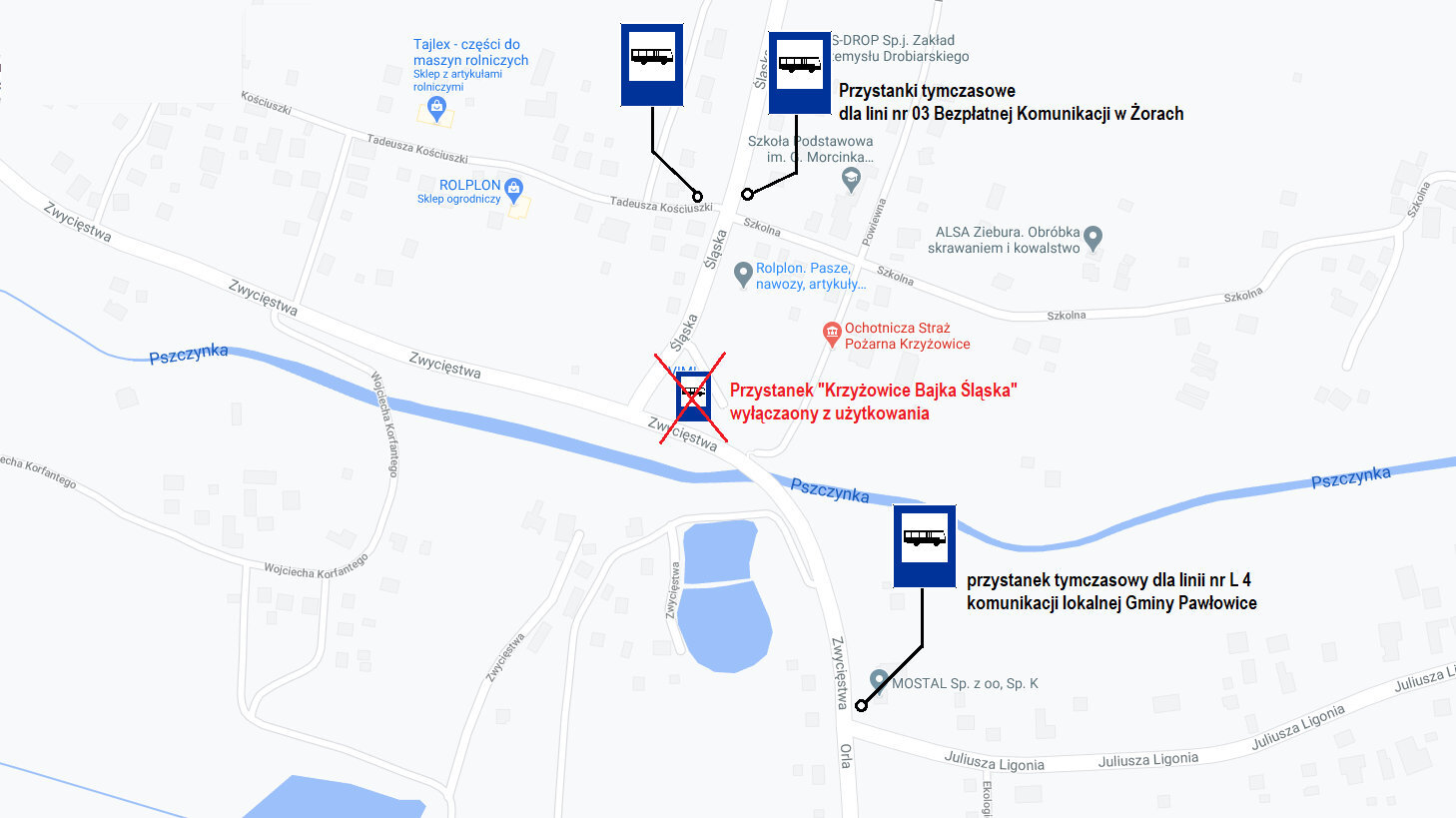 - Na czas prowadzenia robót związanych z przebudową skrzyżowania dróg powiatowych ul. Zwycięstwa i ul. Śląskiej w Krzyżowicach, przystanek „Krzyżowice Bajka Śląska” zostaje wyłączony z użytkowania. Autobusy komunikacji lokalnej linii L4 odjeżdżają w kierunku Pawłowic z tymczasowego przystanku zlokalizowanego obok firmy MOSTAL, natomiast autobusy bezpłatnej komunikacji miejskiej w Żorach odjeżdżają do Żor z tymczasowego przystanku zlokalizowanego w rejonie skrzyżowania ul. Śląskiej z ul. Kościuszki i ul. Szkolną w Krzyżowicach.