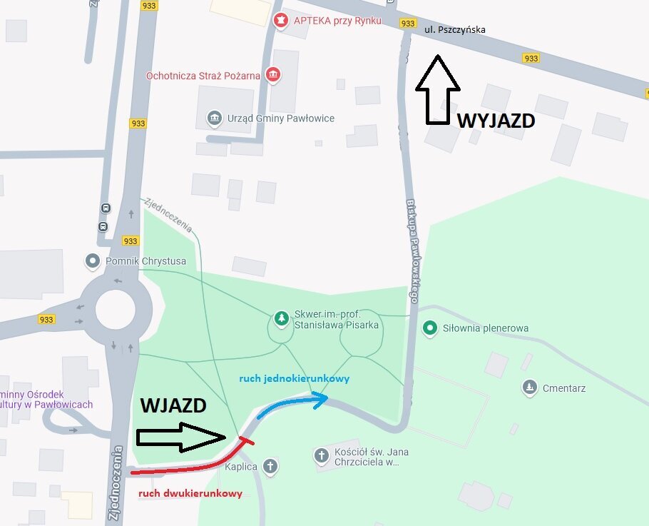 Na odcinku ul. Biskupa Pawłowskiego, od ul. Zjednoczenia do schodów przy kościele św. Jana Chrzciciela, będzie ruch dwukierunkowy, natomiast na odcinku od schodów do wyjazdu na ul. Pszczyńską, wprowadzony zostanie ruch jednokierunkowy. Ul. Biskupa Pawłowskiego jest wąską drogą. Nowa organizacja ruchu ma na celu ułatwienie przejazdu i zwiększenie bezpieczeństwa wszystkich uczestników ruchu odwiedzających cmentarz.