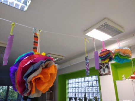 Takie girlandy można zrobić samemu z kolorowej bibuły lub z papieru. Mogą stanowić dekorację pokoju na przykład podczas przyjęcia urodzinowego.