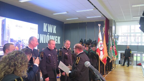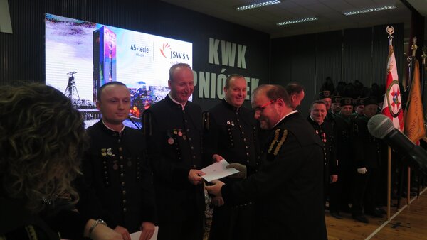 Barbórka była również okazją do wyróżnień i odznaczeń. Złote, srebrne i brązowe „Medale za długoletnią służbę” w imieniu Prezydenta Rzeczypospolitej wręczył wójt Franciszek Dziendziel. Były również odznaczenia „Zasłużonemu dla Górnictwa RP”, „Zasłużonemu dla JSW S.A.” i „Zasłużonemu dla KWK Pniówek”. Na zakończenie oficjalnej części wręczono honorowe szpady górnicze.